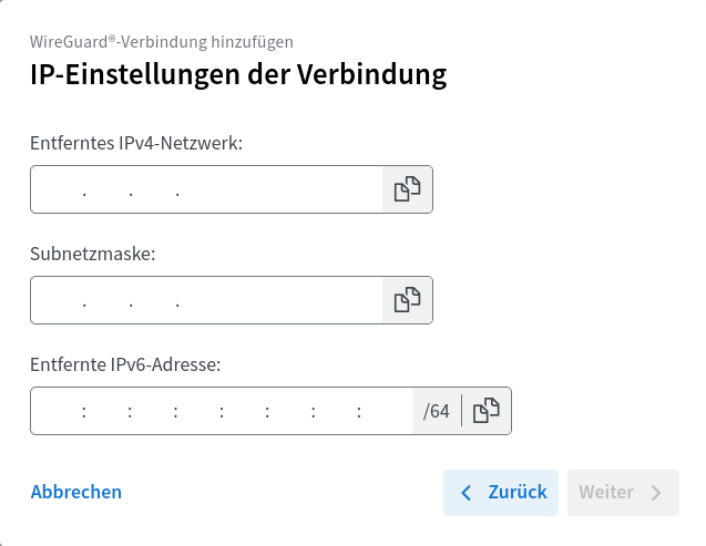 Was für ein Gerät befindet sich auf der Gegenstelle? → WireGuard®-fähiger Router. Keine Ahnung, warum das abgefragt wird, wenn ich am Anfang "Netzwerke koppeln" ausgewählt habe. Ja natürlich muss da ein WireGuard®-fähiger Router sein.